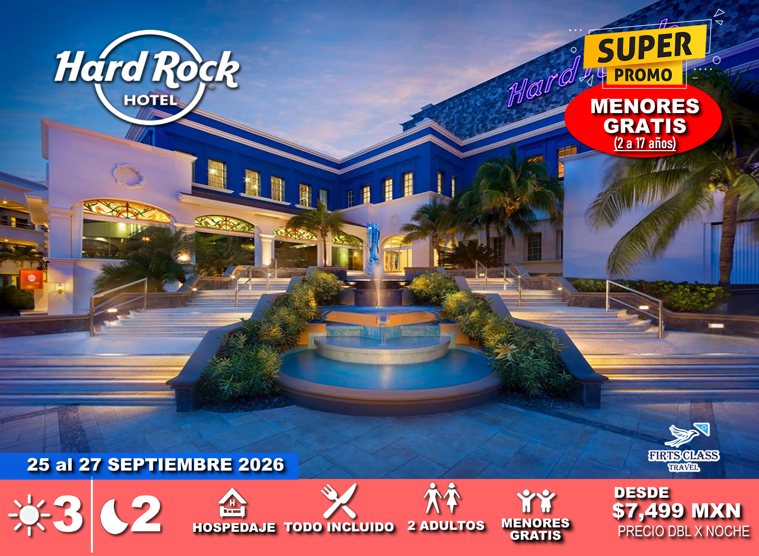 ÚLTIMOS DÍAS HOTEL HARD ROCK RIVIERA MAYA Viaja del 25 al 27 septiembre 2026 3 días 2 noches 2 adultos Menores GRATIS (2 a 17